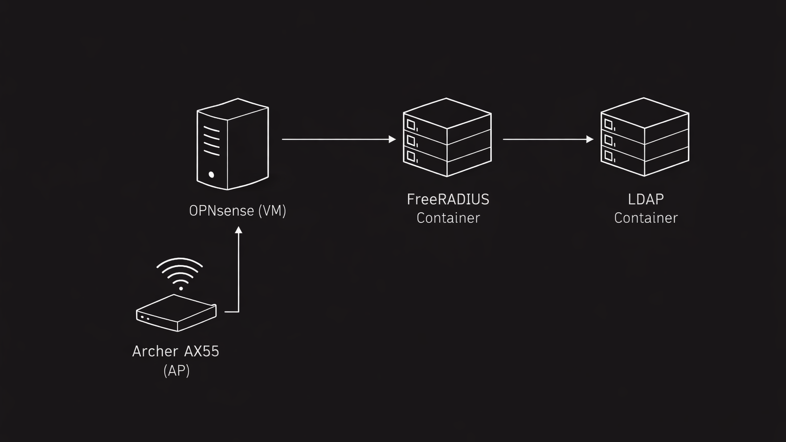 The Archer AX55 is used purely as an access point. It points to my main OPNsense router, which handles DHCP, routing, and forwards RADIUS requests to the FreeRADIUS container. Seeing a client connect for the first time is satisfying: FreeRADIUS looks up the user in LDAP, verifies the password, checks that the user is in the wifi-users group, and grants access.